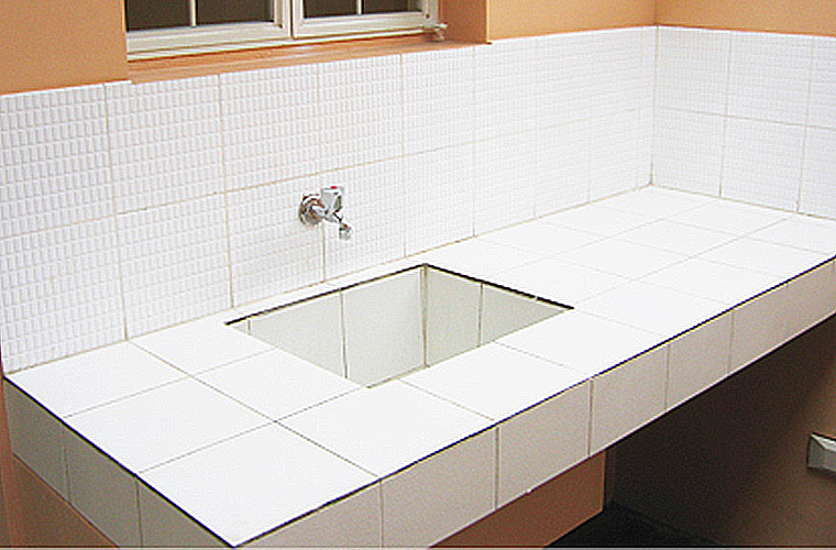 • Kitchen w/ overhead cabinets & porcelain tile countertop and stainless sink